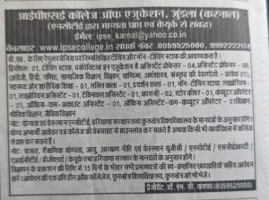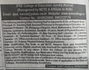 Positions Vacant in IPSE college of education (Advt. Dainik Haryana 19 Jan 2026)